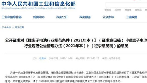 工業(yè)和信息化部11月18日信息顯示,為進一步加強鋰離子電池行業(yè)管理,推動行業(yè)轉型升級和技術進步,工業(yè)和信息化部(電子信息司)組織修訂了《鋰離子電池行業(yè)規(guī)范條件(2021年本)》(征求意見稿)和《鋰離子電池行業(yè)規(guī)范公告管理辦法(2021年本)》(征求意見稿),現(xiàn)公開征求意見。其中,《鋰離子電池行業(yè)規(guī)范條件(2021年本)》(征求意見稿)提出,引導企業(yè)減少單純擴大產(chǎn)能的制造項目,加強技術創(chuàng)新、提高產(chǎn)品質量、降低生產(chǎn)成本。 -