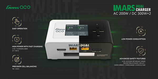 格氏ace iMars Dual/D200雙通道智能平衡充電器有一個(gè)內(nèi)置的直流電源,可在比賽現(xiàn)場為您的RC配件供電,例如輪胎加熱器、直流電烙鐵或LED顯示器等;充電器內(nèi)部采用了直通流線型通風(fēng)堆疊設(shè)計(jì),高效散熱;先進(jìn)的電路設(shè)計(jì)搭配阻燃等級達(dá)到UL94-V0標(biāo)準(zhǔn)的外殼,使得充電器更加安全高效,有效防止短路/過流/過充/過壓。